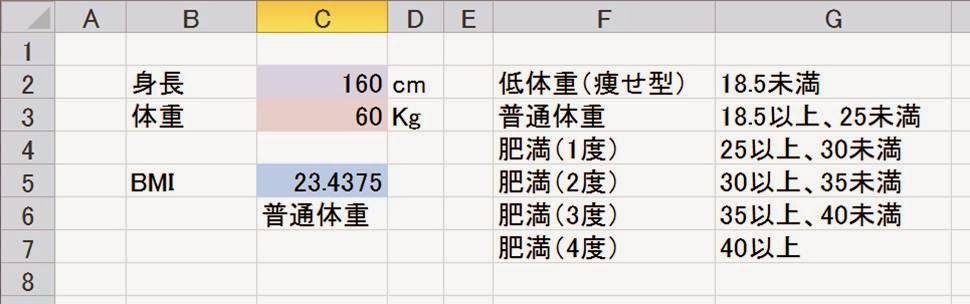 Excel Bmi指数と肥満度の判定 標準体重比 美容体重 モデル体重の